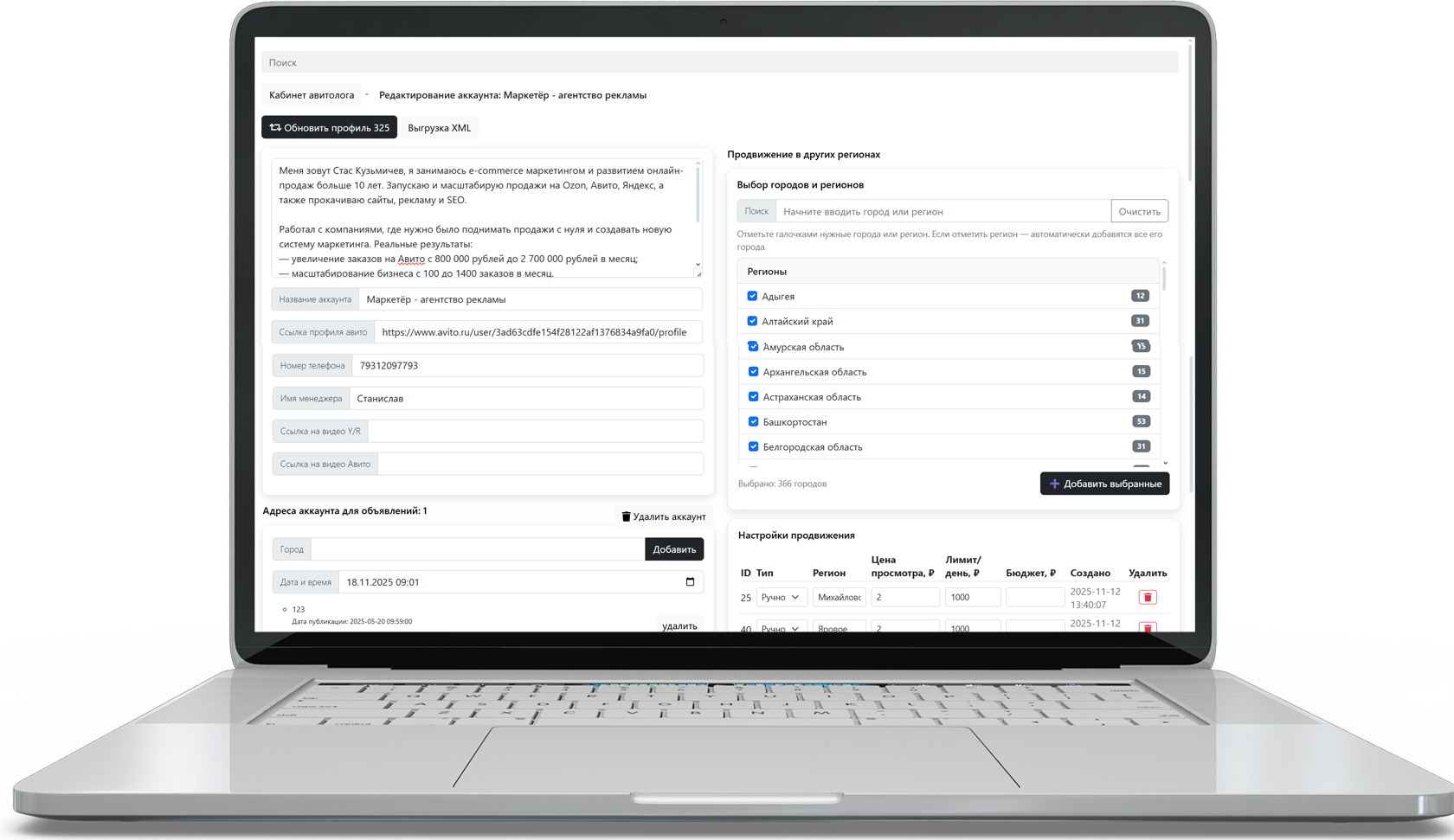 Вёл 12 аккаунтов одного клиента с общим объёмом 500 000+ активных объявлений. Настройка ротации, обновлений, позиций и структуры категории.